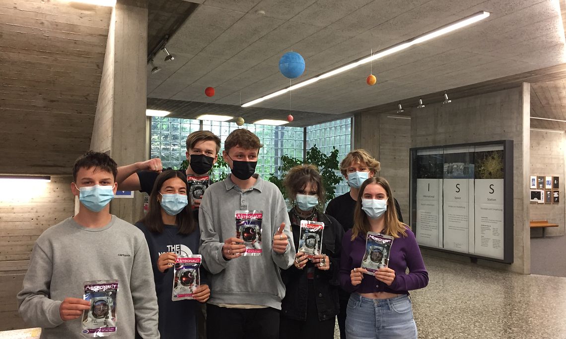Ein Konzeptteam der Klasse baute dreidimensionale Himmelskörper aus Styropor und eine ISS aus Alufolie und Draht, welche der Ausstellung im Eingangsbereich der Schule eine faszinierende Raumtiefe verliehen. Mit einem Beamer wurde eine Bildstrecke rund um die ISS, sowie ein Livestream aus der ISS direkt aus dem Weltall an die Wand projiziert. Ein gelungenes Projekt, das die 4a zu Recht mit Stolz erfüllte und ihnen trotz der angespannten Coronasituation ein Lächeln ins Gesicht zauberte! Zum Abschluss wurde der grossartige Einsatz der 4a mit einer Auswahl von gefriergetrockneten «space icecream» honoriert, gesponsert vom Ehemaligenverein VEGL.